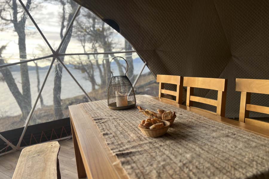 La experiencia culmina con un encuentro cálido y gastronómico en un domo calefaccionado, donde los espera una cena con menú regional especialmente preparada para este momento. Sabores patagónicos acompañados de vinos y bebidas locales harán de este cierre una vivencia inolvidable, que combina naturaleza, aventura y hospitalidad.