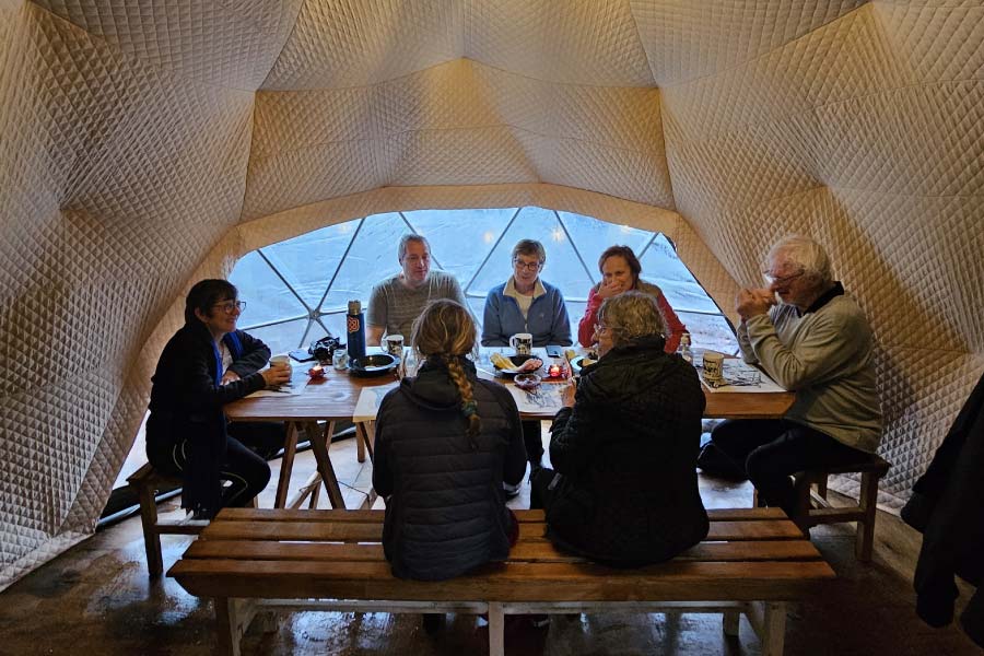 La tarde irá cayendo y dejándonos las últimas luces para llegar a nuestro domo de montaña donde los espera un vino caliente del refugio junto al calor del fuego.