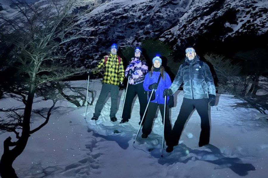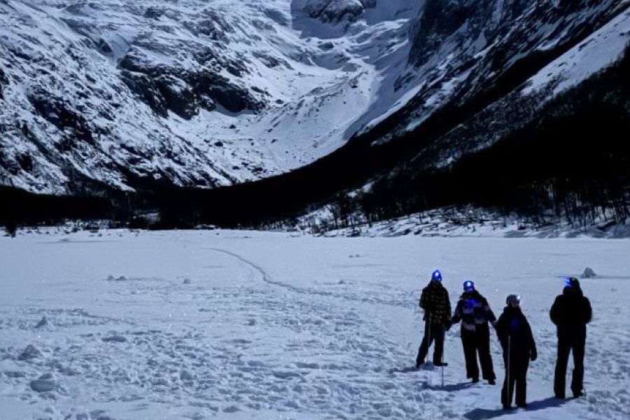 La experiencia incluye una caminata con guías especializados por los bosques fueguinos bajo la luz de las linternas. Con crampones y bastones, el trekking adquiere una dimensión distinta: el silencio de la naturaleza, los sonidos ocultos de la noche y la inmensidad de los valles glaciares revelan una Ushuaia diferente, serena y profunda.
